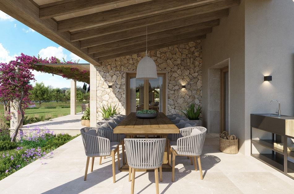 This newly built finca offers approx. 380 m² of living space, spread over two floors, with a harmonious room layout. The entrance lobby leads into a bright, spacious living room, which opens onto the dining area and adjoins a semi-open-plan kitchen. You will also find two bedrooms (one of which has an en suite bathroom), a bathroom, a utility room and a guest toilet.All areas of the ground floor have access to the various terraces outside.The upper floor has two further bedrooms (one of which has an en suite bathroom), a bathroom and a media room. The exposed ceiling beams throughout the property emphasise the colour composition and the integration of the finca into the natural surroundings. The warm tone of the stone floor harmonises exceptionally well with the brightness of the rooms and makes them stand out, while the beautiful Mediterranean garden with its very large swimming pool of 72 m² (18 x 4 m) offers many possibilities for the whole family and friends, not just for sports. The property is expected to be completed in August 2023.